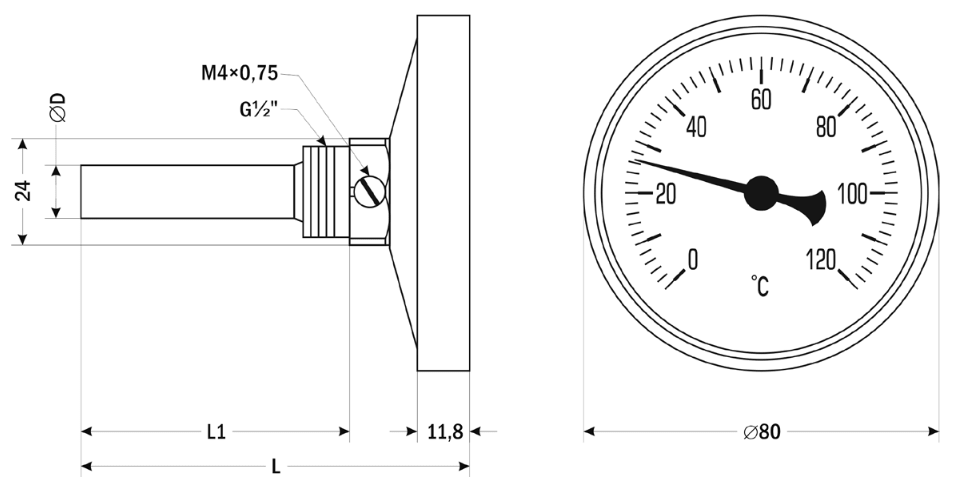 Биметаллический термометр ТБП-А используется для измерения температуры газообразных и жидких сред в системах отопления, бойлерах, котельных, теплоэнергетических станциях. Приборы также широко применяются в системах кондиционирования и вентиляции. Термометры комплектуются съемной гильзой